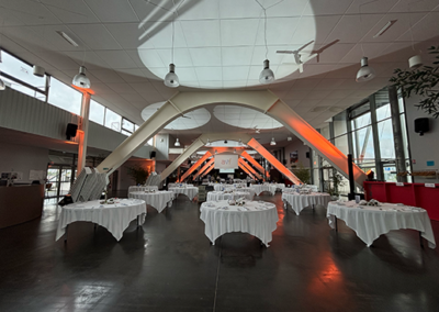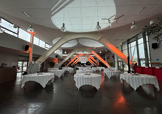 Sublimer un espace aussi vaste était un défi passionnant. Nous avons installé 20 lumières robotisées pour créer des ambiances lumineuses évolutives et mettre en valeur les magnifiques arches métalliques du lieu. Une scénographie lumineuse sur mesure a permis d’apporter un impact visuel à chaque moment clé de la soirée.