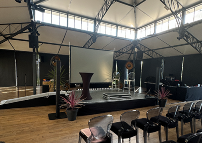 Pour offrir une visibilité optimale aux intervenants, nous avons conçu et installé une scène adaptée aux dimensions de la salle et aux besoins de l’événement. Fonctionnelle et élégante grâce à une moquette noire, elle a permis de structurer l’espace et d’assurer un confort maximal pour les orateurs comme pour le public.